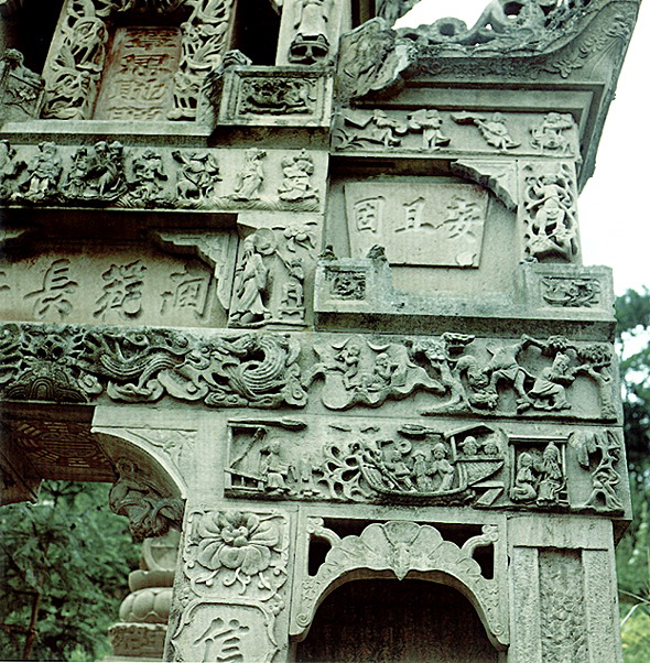石雕 湖北省北有秦嶺東沿的武當(dāng)山、大別山、桐柏山,西接云貴高原,東南為幕阜山脈環(huán)繞,中部是寬闊的江漢平原。山區(qū)產(chǎn)石料,為石雕提供了豐富的用材;平原燒泥土制磚瓦,鐫以圖案美化建筑。民間石雕、磚雕分布,與地形大體一致。?凳耦}材廣泛,大致分為日常生活、倫理教化、神話傳說(shuō)、戲文故事、花鳥(niǎo)蟲(chóng)魚(yú)、書(shū)文楹聯(lián)六類(lèi)。
